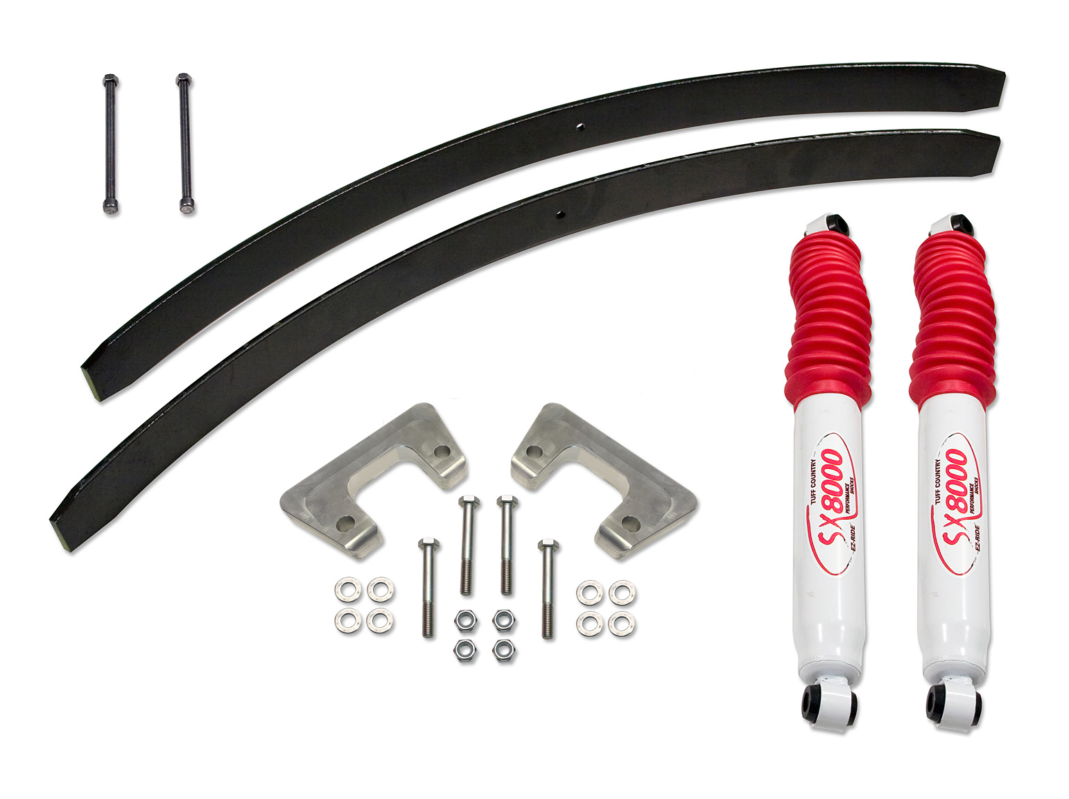 Gain additional tire clearance with this Tuff Country EZ-Ride Suspension Chevy Silverado 1500 2" EZ-Install lift kit. This simple to install lift kit uses lower strut / coil spring spacers that mount to the bottom of the strut. This makes installation much easier than the standard upper coil strut spacers. Rear add-a-leafs raise the back end 2 inches. Once installed the front end will be slightly lower than the rear. New shocks / struts are not required to install this lift kit properly.