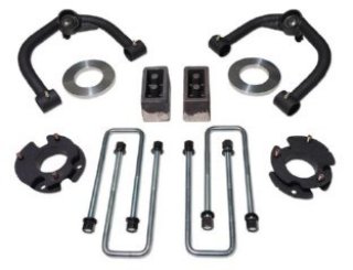 kit. This suspension lift is a great compromise between those who are looking for a little more than just a leveling kit but not looking to tackle all the modifications of a larger kit. It’s simple design includes a new set of control arms to keep the alignment geometry straight. A strut spacer as well as a pre-load spacer give the front end the lift followed by a 1″ block and longer u-bolts to finish out the rear end. The kit is designed to lift and level the truck so you will not have to purchase a separate leveling kit for this truck to sit level. It’s affordable cost is definitely a plus and the ease of installation means you won’t have too much tied up in installation fees if you decide to have it professionally installed. This F150 lift kit recommends a 33 x 12.50 tire with a wheel that has a 5.5 or less backspacing (will fit up to 35″ tires with a little trimming). The stock tire and wheel combo will fit with this lift if desired, but it will not allow for a wider tire with the factory rims or contact with the upper control arm will occur.