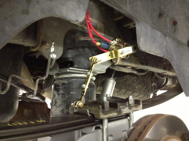 As the suspension cycles, the arm attached to the axle moves the height sensor up or down. This adjusts the air pressure in the bags and shocks. If a heavy load is placed on the truck the arm will be forced up signaling the demand of more air in the bags to level the truck out. When the load is lifted the sensor arms will be pulled down activating the dump valves to equal out the air pressure in the bags until level is reached.