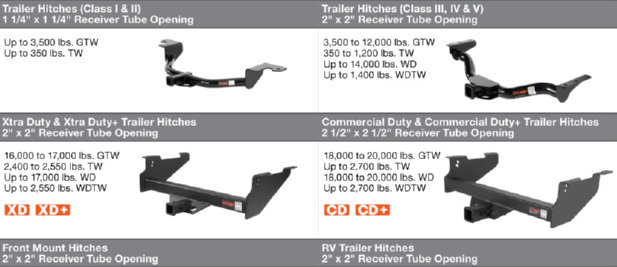 Rear Pull Hitches are divided into different classes. They have class 1 and 2, class 3, 4 and 5, Xtra duty and Xtra duty+,