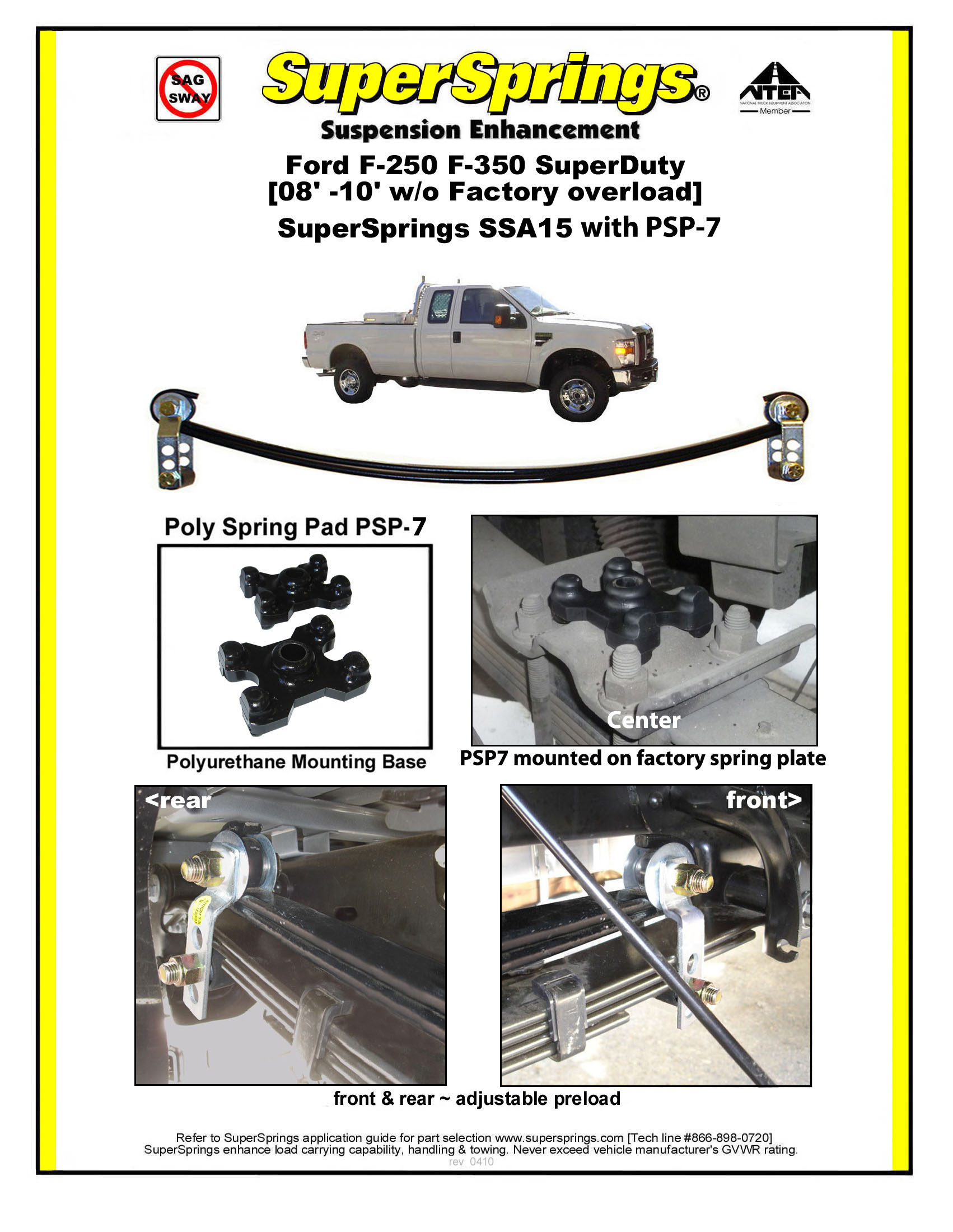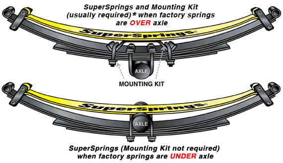 SuperSprings are adjustment free helper springs that mount above your vehicles factory springs to provide additional load support and to reduce body roll by up to 30%. This unique stabilizing system uses a shackle with a roller on each end of the springs to which allows the Ford F350 SuperSprings to activate when needed. If needed you can level or lift from side-to-side or front-to-rear with the shackles muti-hole settings.