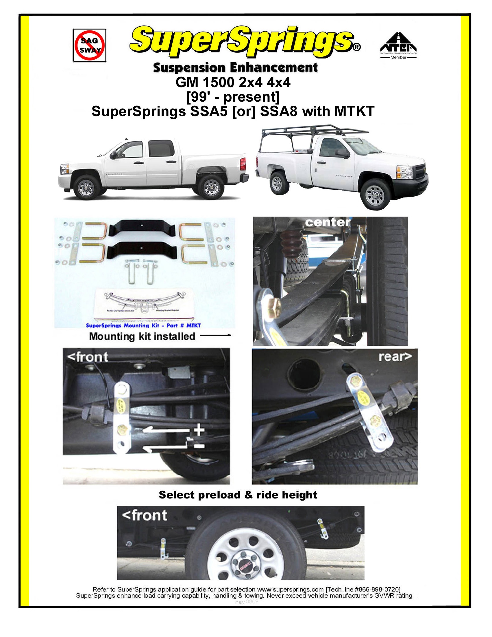SuperSprings are adjustment free helper springs that mount above the factory springs to provide additional load support and to reduce body roll by up to 30%. This unique stabilizing system uses a shackle with a roller on each end of the springs to which allows the Chevy Silverado 1500 SuperSprings to activate when needed. If needed you can level or lift from side-to-side or front-to-rear with the shackles muti-hole settings.